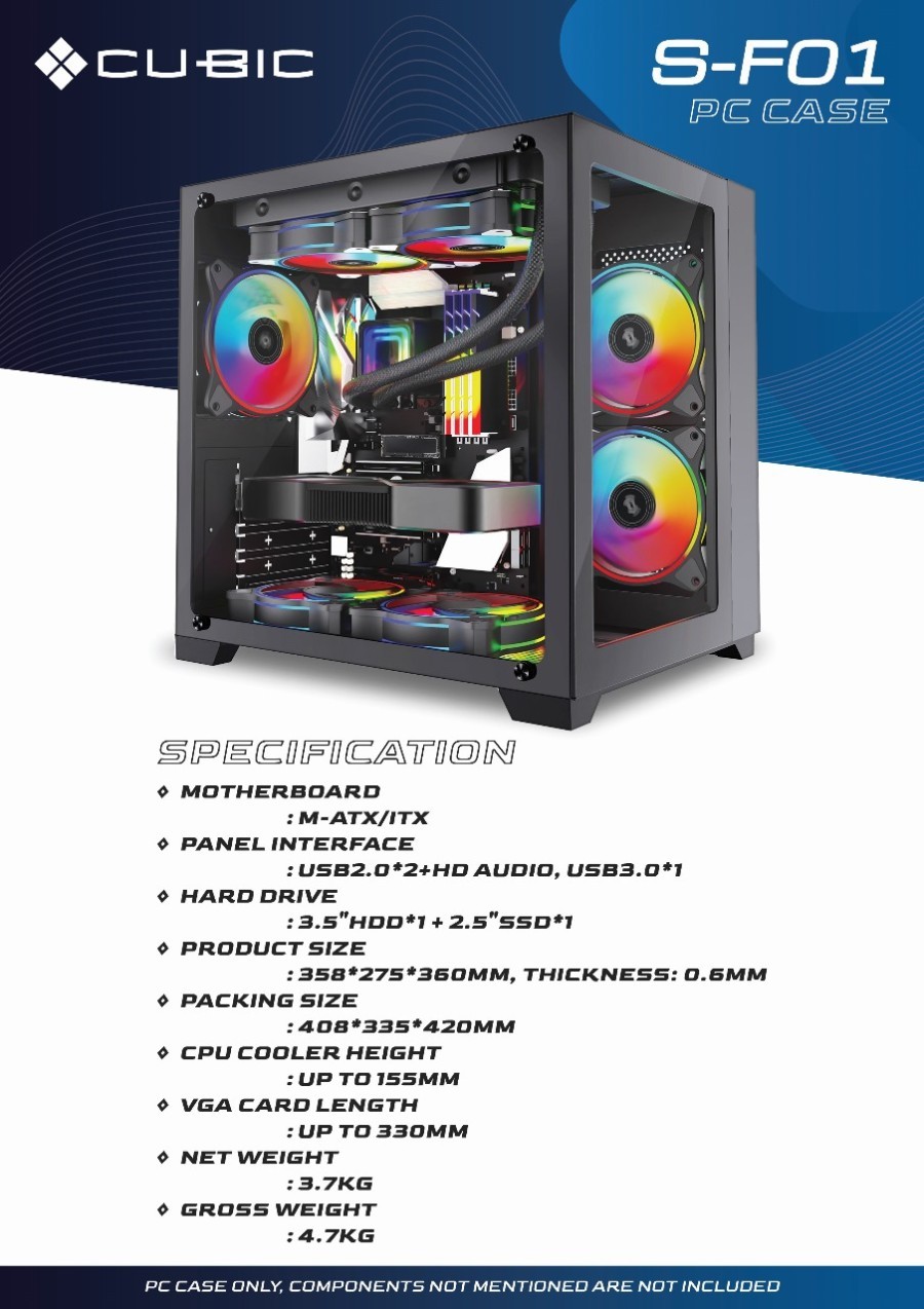 Rp 6.490.000 Rp 7.250.000SPECIFICATIONS Model SKY TWO Color Black and White Dimensions(LxMxH) 430x215x490mm(Case)/490.5x287x552mm(Carton) MB Support ATX,Micro-ATX,Mini-ITX Front I/O 1xType-C/2xUSB3.0/1xMic/1xAudio/LED Button PCI Slots 7 Compatibility/Maximum CPU Cooler 168mm GPU 400mm PSU 210mm ATX PSU Drive Bay 3.5”HDD 2 2.5”SSD 3 Pre-installed Fan(s) Side 2x120mm (RX120 PWM Fans) PSU shroud 1x120mm (RX120 PWM Fans) Rear 1x120mm (AX120 PWM Fans) Fan… selengkapnya