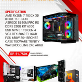 SPESIFICATION AMD RYZEN 7 7800X 3D 8 CORE 16 THREAD ASROCK B650M PRO RS DDR5 32GB KIT 6000 SSD NVME 1TB GEN 4 VGA RTX 5060 TI 16GB PSU 650W 80+ BRONZE CASE TECWARE TRINITY WATERCOOLING 240 ARGB