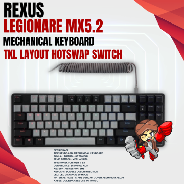 Rexus Legionare MX5.2 FINALE mempunyai 87 tombol. Dengan desain dan ukuran yang kompak tersebut, keyboard ini praktis untuk digunakan dalam beragam aktivitas dan permainan.