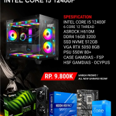Rp 4.990.000 Rp 5.250.000SPESIFICATION INTEL CORE I5 12400F 6 CORE 12 THREAD ASROCK H610M DDR4 16GB 3200 SSD NVME 512GB VGA RTX 5050 8GB PSU 550W 80+ CASE GAMDIAS – FSP HSF GAMDIAS – OCYPUS RP. 9.800K