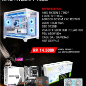 Rp 8.450.000 Rp 8.990.000SPESIFICATION AMD RYZEN 5 7500F 6 CORE 12 THREAD ASROCK B650M PRO RS WIFI DDR5 16GB 5600 SSD 512GB VGA RTX 5060 8GB POLAR FOX PSU 650W 80+ CASE DA – GAMDIAS HSF OCYPUS